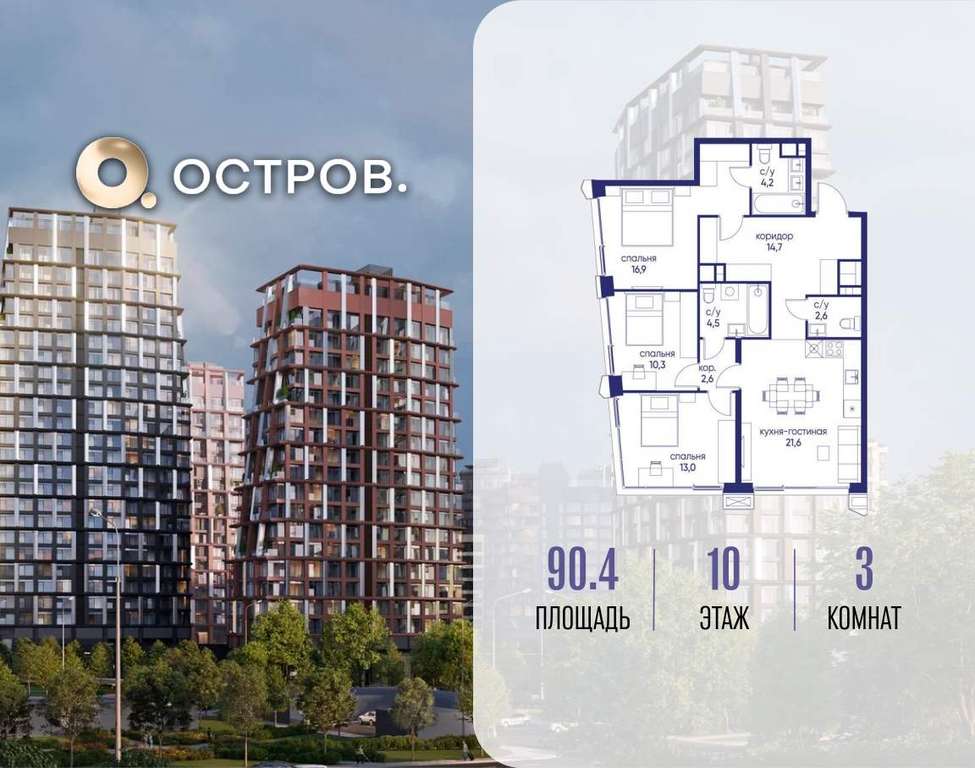 Продаётся 3-комн. квартира от застройщика: общая площадь 90.40 м, жилая 40.20 м, кухня 21.60 м, 10-й этаж, жилой квартал «Остров 14», корпус 4 (секция 1) . Срок сдачи: 2 квартал 2029 года.