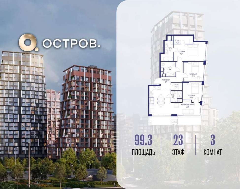Продаётся 3-комн. квартира от застройщика: общая площадь 99.30 м, жилая 39.50 м, кухня 29.80 м, 23-й этаж, жилой квартал «Остров 14», корпус 6 (секция 1) . Срок сдачи: 2 квартал 2029 года.
